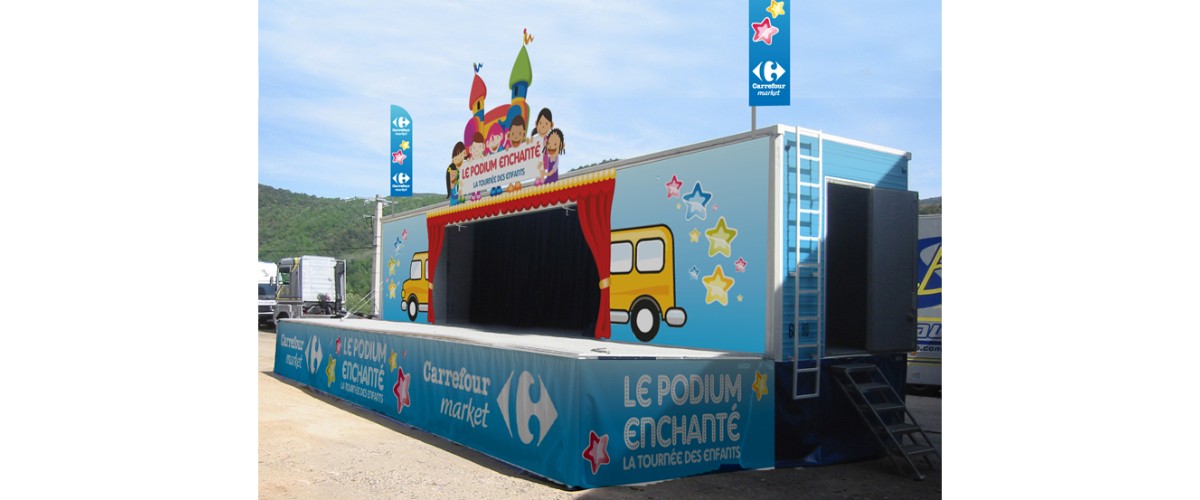 Notre société possède un semi podium de 12 m de long avec ouverture de scène sur toute la longueur permettant d’avoir une partie couverte et une partie découverte, le podium est équipé d’une partie son et éclairages, pour de l’animation commerciale ou remise de prix. (sur devis nous pouvons nous adapter à vos fiches techniques).